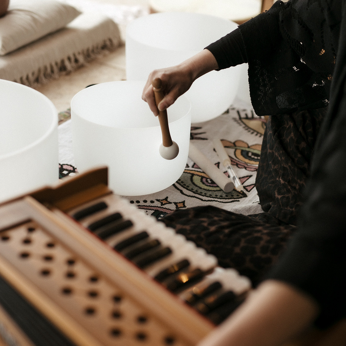 J’utilise une grande diversité d’instruments : harmonium, bols de cristal, tambour, arbre de pluie, songpods, ocarina, carillons, svaraveena… Chaque séance est entièrement personnalisée, en résonance avec vos besoins et vos intentions du moment.